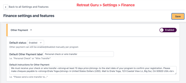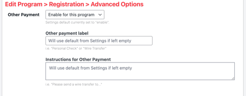 You can override the default settings that you configured in Settings on a program-by-program basis at: Programs > Edit Program > Registration > Advanced Options > Other Payment.
