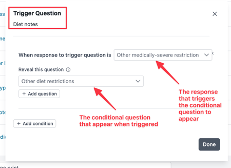Click + Add question if you want to display additional conditional fields when the response to Diet notes is Other diet restrictions.